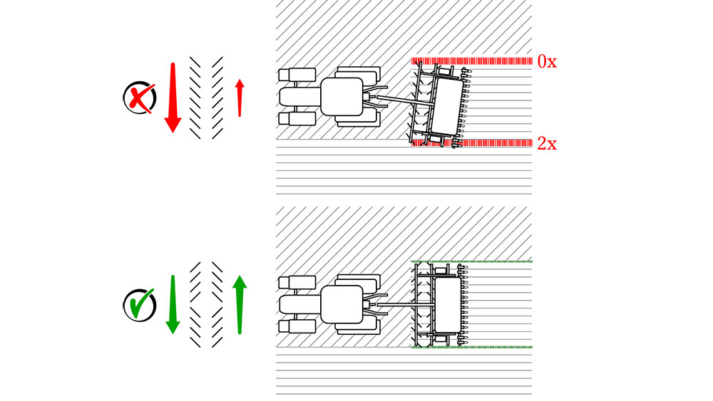 OffSet means that every second packer wheel is displaced 250mm backwards on a separate axle. According to studies, OffSet minimises bulldozing and lowers the draught requirement by 25%. An additional advantage is that the design is less susceptible to vibrations, resulting in higher drilling accuracy.