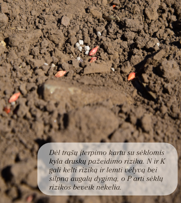 2. Įterpiant trąšas sėjimo metu kyla rizika – druskos žala, vėlesnis sudygimas ir pan. |